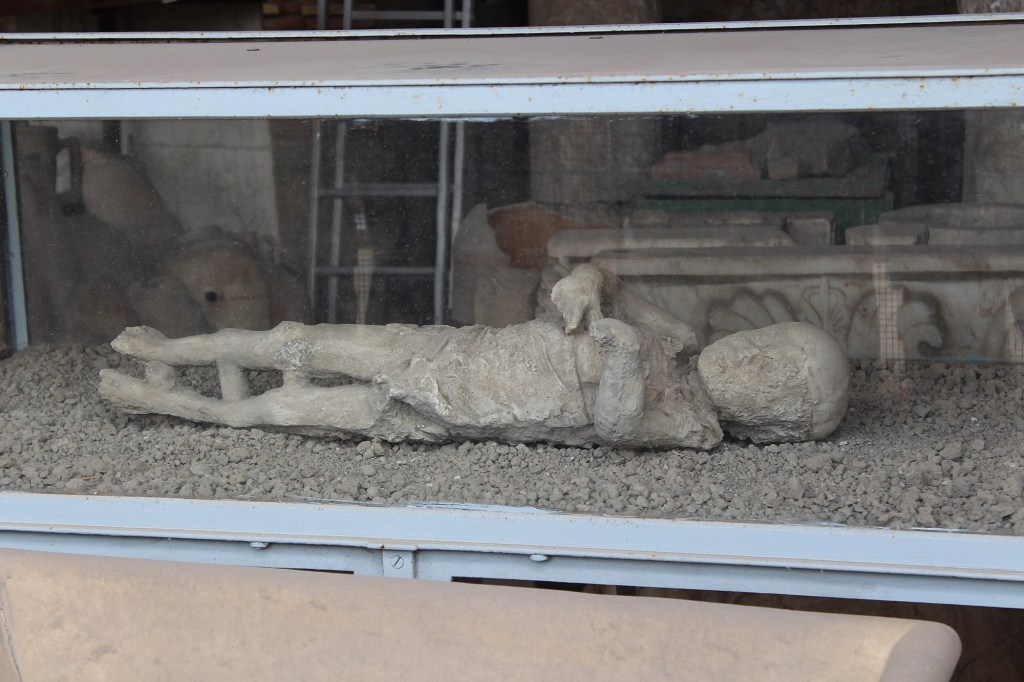 I samband med Vesuvius utbrott år 79 e.Kr så vet man inte exakt hur många människor som egentligen dog. Inne i Pompeji har man hittat kvarlevorna av lite över 1200 personer, men huruvida de övriga invånarna klarade sig eller om de går att återfinna i de ännu inte utgrävda områdena är idag omöjligt att säga. Vad vi vet är att av de som har hittats inne i Pompeji så har de flesta förolyckats till följd av de pyroklastiska flöden i form av gasmoln som uppnådde nästan tusen grader när de kom rullande i en hisnande fart nedför vulkanens sluttningar och in över staden. När man avlider till följd av dessa höga temperaturer är döden ögonblicklig. Det innebär att de offer vi möter i Pompeji befinner sig i exakt samma position som i det ögonblicket de förolyckades.