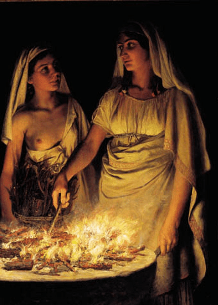 Den romerska gudinnan Vesta ansågs inte enbart vara härden och hemmets viktigaste gudom, hon hade även en viktig roll i den romerska statskulten. I Vestas tempel på Forum Romanum i Rom fanns nämligen den heliga eld som aldrig fick slockna, om elden dog ut så betydde det även slutet för Rom, i alla fall enligt de ibland löjligt vidskepliga romarna. Eftersom elden var så pass viktig så var det nödvändigt att den var under konstant bevakning och detta sköttes av ett kvinnligt prästkollegium som kallades för vestaler.