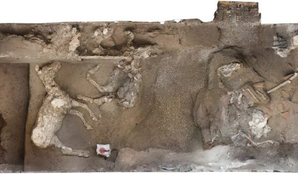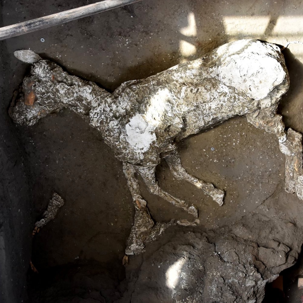 Det första uppmärksammade fyndet som gjordes var ett stall med tre fullblodshästar. Man lyckades göra en hel avgjutning av en häst (vilken nu finns på Pompejis museum), en avgjutning av benen på den andra, medan gravplundrarnas aktiviteter tyvärr hade lett till att marken var för skadad för att man skulle kunna göra en avgjutning av den tredje hästen. Två av hästarna ligger på sidan, med huvudet vilandet på frambenen. Antagligen var de fastbundna vilket gjorde att de inte kunde ta sig loss och att det är därför de avled i dessa positioner. Förutom hästarna hittade man även en del föremål i brons som tros ha tillhört en sadel av den speciella modell som användes under antiken. Andra fynd tros tillhöra speciella selar som vanligtvis användes av ridande soldater under parader. Där fanns även fynd från speciella täcken man hade på hästar under sådana parader. Tyvärr så är det en hel del synd som förefaller saknas för att dessa föremål ska vara kompletta, vilket tros bero på att gravplundrarna stal de mest iögonfallande föremålen i rummet. Att hästarna stod bundna i stallet fullt selade tyder på att man hade gjort dem i ordning för att snabbt kunna fly, något som dessvärre inte ser ut att ha gått speciellt bra.