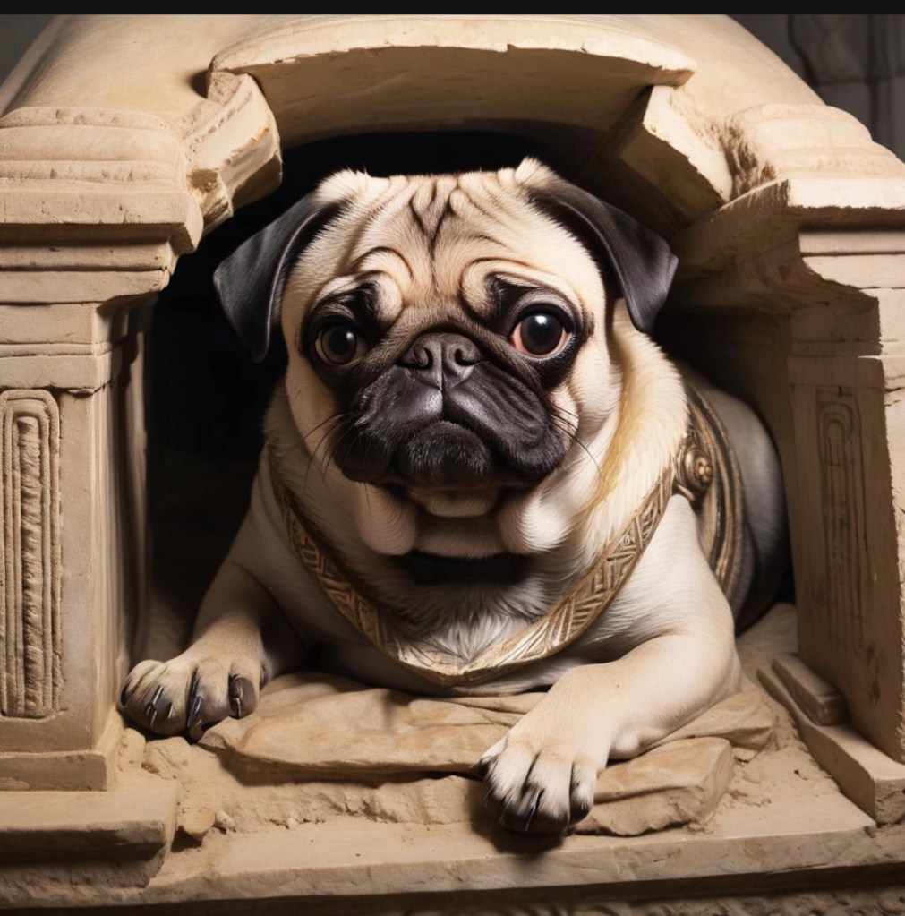 Den dyker emellertid upp igen, tyvärr nu utan mops, på en offentlig försäljning av antika föremål hos auktionsfirman Sotheby’s. Sarkofagen hade utropspriset 5000 GBP, men såldes för inte mindre än 40.000 GBP. Vem den nya ägaren är, eller vad hen ska ha sarkofagen till förtäljer dock inte historien. Vi hoppas på att den är ämnad åt ännu en mops, eller kanske en sympatisk hamster eller något annat rart husdjur. Hur det gick med Gaius och Harlequins kvarlevor vet vi inte heller, men vi hoppas att de båda vilar i frid.