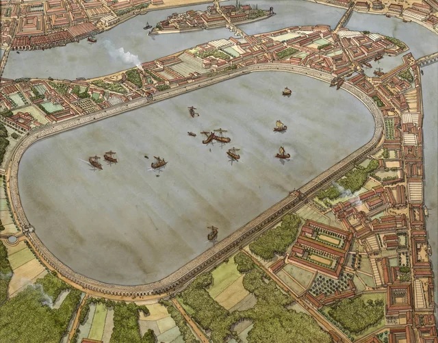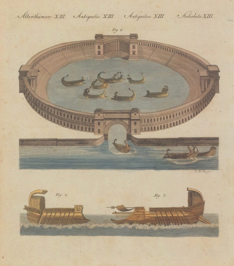 Som vi tidigare berättat så var romarnas absoluta favoritnöjen de blodiga tävlingar och spel som ägde rum på de olika arenorna runt om i riket. Ett av de mer spektakulära evenemangen var de regisserade sjöslag som av romarna kallades för naumachia. Dessa ägde rum inne på vattenfyllda arenor eller på floder inne i städerna. Deltagarna spelade ofta upp riktiga historiska händelser och det hela var som en slags teaterföreställning som vanligtvis gick ut på att två olika parter stred mot varandra. Skillnaden mot vanliga teaterföreställningar var att de som här tvingades deltaga var krigsfångar, dömda brottslingar, eller andra som på något vis hade stött sig med kejsaren och dömts till döden. Oavsett utgången så skulle således alla deltagare dö förr eller senare.