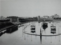 Man har uppfört naumachia även under senare tid. Detta är en bild från 1863 på Arena Civica i Milano, vilken vattenfyllts för att ett enklare sjöslag skulle kunna iscensättas.