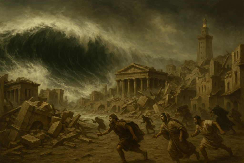 De antika människorna hade emellertid lite svårt att förstå exakt vad detta egentligen var. I brist på vetenskapliga förklaringar så tolkades tsunamis vanligtvis som tecken från gudarna eller mytologiska straff.